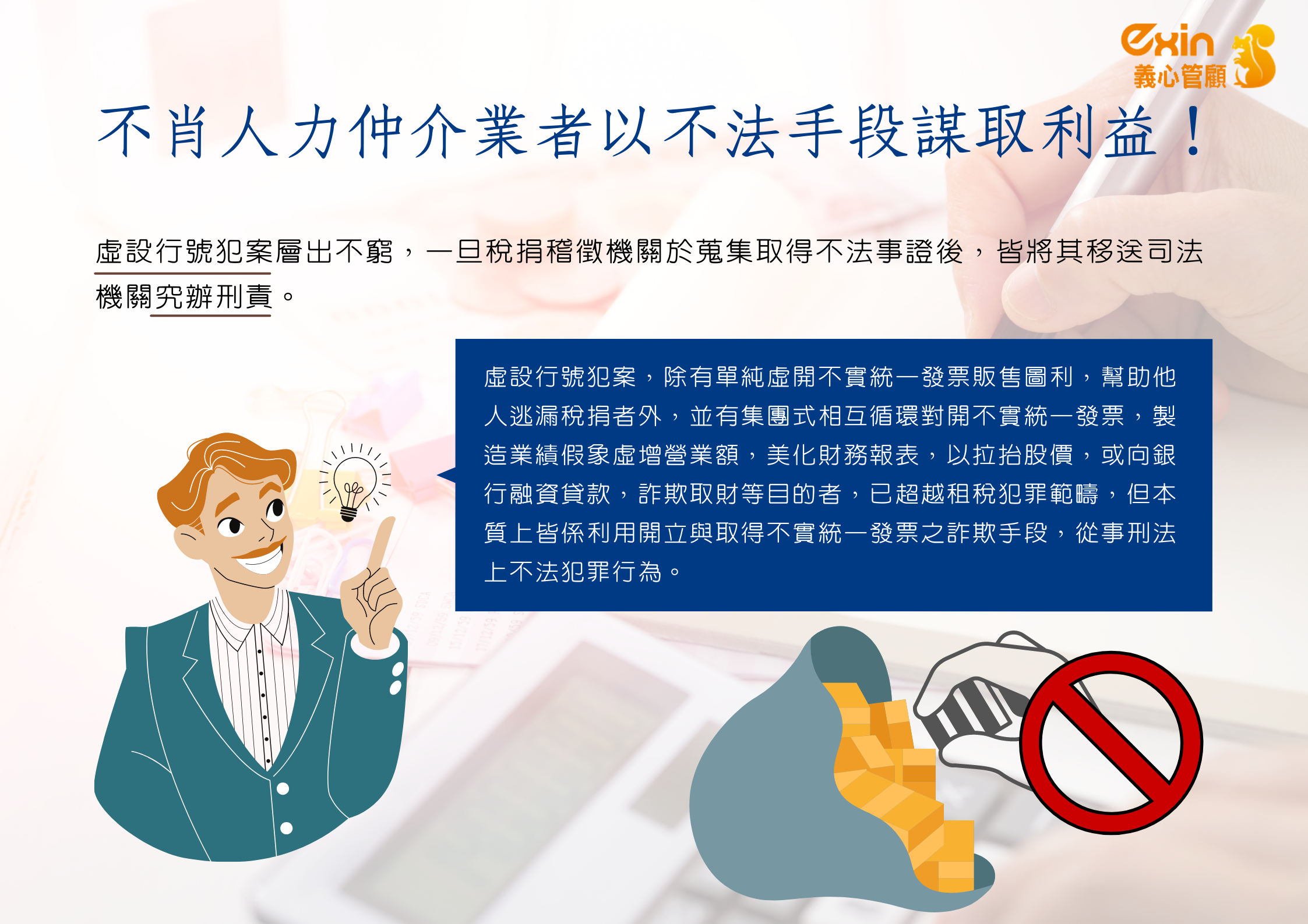 該局鄭重呼籲,民眾切勿因貪圖一時利益而以身觸法,不可利用虛設公司行號從事不法行為,以免觸犯詐欺、偽造文書、使公務人員登載不實、幫助逃漏稅捐等罪而受刑事之制裁。民眾如有任何疑問,可撥打免費服務電話0800-000321,該局將竭誠為您服務。
